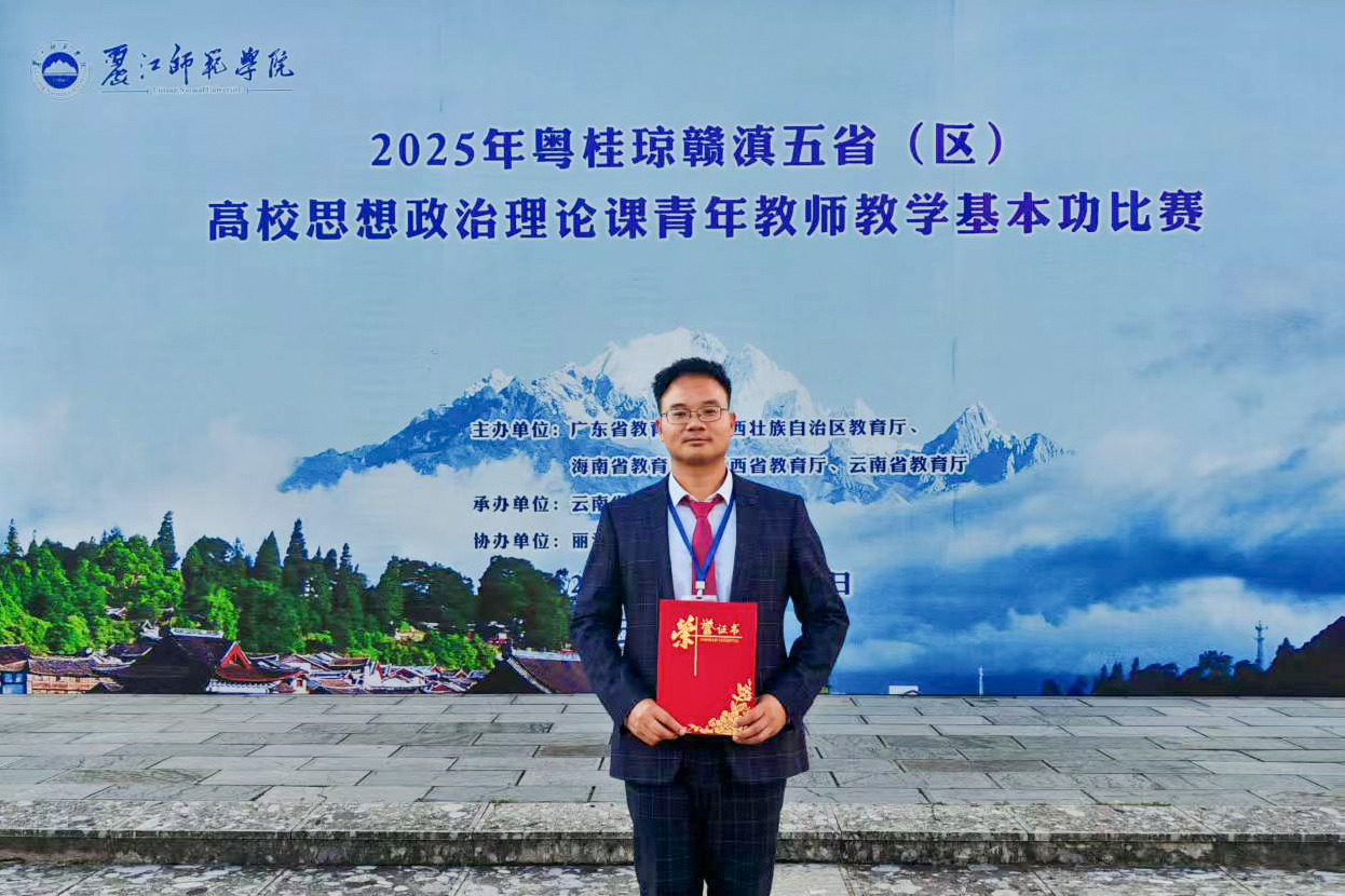 近日,2025年粤桂琼赣滇五省(区)高校思想政治理论课青年教师教学基本功比赛在丽江师范学院落下帷幕。我们必赢中国官方网站教师梁新堂以扎实的理论储备、创新的教学设计及优异的现场发挥,在本科组比拼中斩获三等奖,充分彰显了我们青年思政课教师的卓越素质与教学风范,这亦是我们首次在该类竞赛中取得突破。